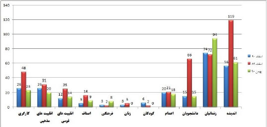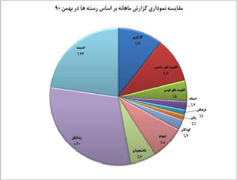 نمودار زیر مقایسه گزارش ماهانه بر اساس گستره رسته‌ها دراسفند ماه ۱۳۹۰ است، همانطور که در ذیل مشاهده می‌کنید، زندانیان با ۳۰% و حوزه اندیشه و بیان با ۲۳% به ترتیب در رتبه اول و دوم تعداد موارد گزارش شده از سوی گزارشگران حقوق بشر قرار دارند.