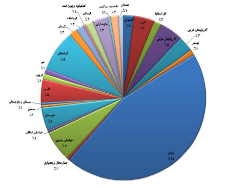 در ادامه می‌توانید نمودار دایره‌ای مربوط به مقایسه استان‌ها و حجم گزارشات ثبت شده که رابطه مستقیمی با توان گزارشگران حقوق بشر در ایران دارد را مشاهده نمائید.