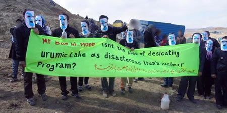 يوردنت: فعالين ملی و مدنی آذربايجان روز ۱۳ فروردين، روز طبعيت را با گردهمايی برای درياچه اورميه گرامی داشتند. امسال نيز برای سومين سال متوالی روز سيزده بدر در شهرهای مختلف آذربايجان با اعتراض به وضعيت اسفناک درياچه اورميه برگزار شد. بنا به گزارشات و عکس های ارسالی منابع محلی، دهها تن از قعالين حرکت حرکت ملی و مدنی آذربايجان در شهرهايی چون اورميه، تبريز و مشگين شهر با در دست داشتن پلاکاردهايی و سر دادن شعارهايی اعتراض خود را نسبت به سياست جمهوری اسلامی در قبال خشکاندن درياچه اورميه ابراز داشته اند. معترضين آذربايجانی که ديگر از بی توجهی حکومت ايران به اين مسئله مايوس گشته اند با نوشتن پلاکاردهايی تلاش کردند تا اينبار بطور مستقيم دقت جامعه جهانی بخصوص سازمان ملل متحد را به فاجعه عمدی زيست محيطی درياچه اورميه جلب کنند. در يکی از اين پلاکاردها که خطاب به دبير کل سازمان ملل است چنين نوشته شده است: " آقای بان کی مون، آيا طرح خشکاندن درياچه اروميه به اندازه برنامه هسته ای ايران مصيبت بارتر نيست؟ "
